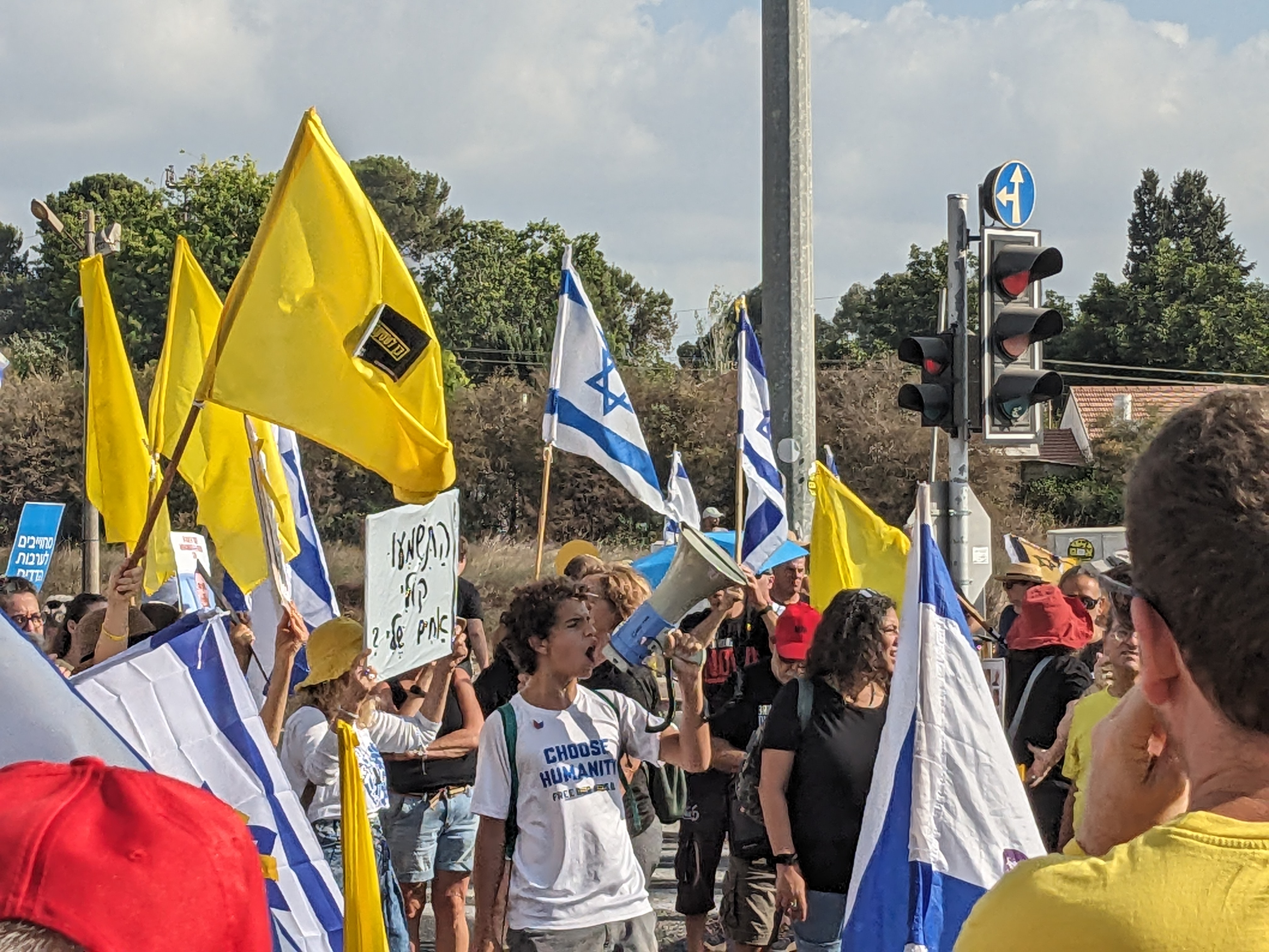 Together with Liat, I go to one of the first rallies at 8 a.m. at one of the intersections near her kibbutz. It doesn’t take long before some of the 500 demonstrators block the road. They are loud, absolutely furious, and fully committed despite the rising heat. Banners reading “Stop the Operation of Death” are held along the street, dominated by yellow and Israeli flags.
