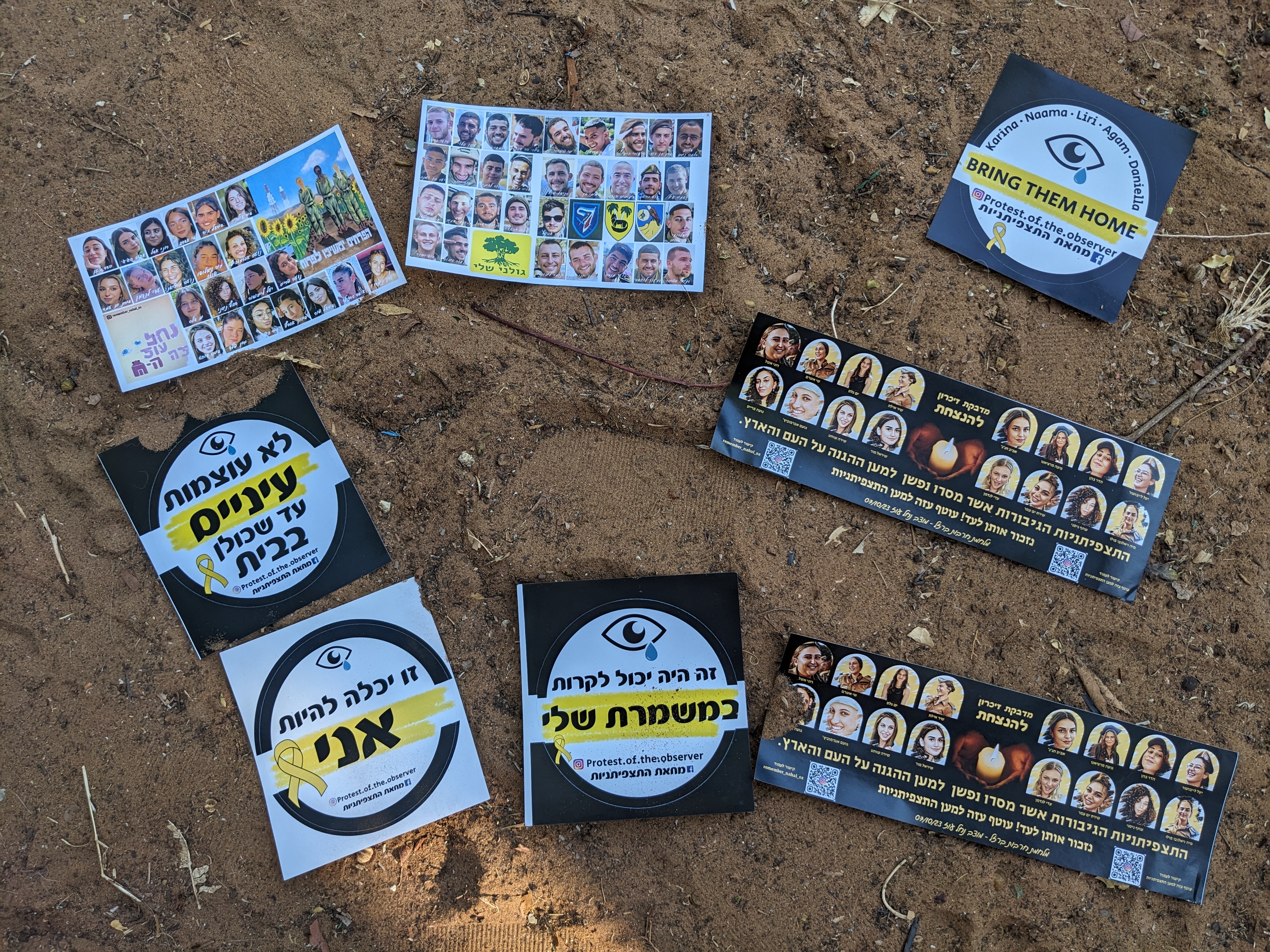 Sticker mit der Aufschrift „Nicht die Augen schließen bis sie wieder zu Hause sind!“, „Das hätte auch ich sein können.“, „Das hätte auch in meiner Schicht passieren können.“ Zudem Fotos der ermordeten und entführten Soldatinnen. Ein Sticker zeigt auch die Fotos der Soldaten, die dem Hamas-Angriff zum Opfer fielen.