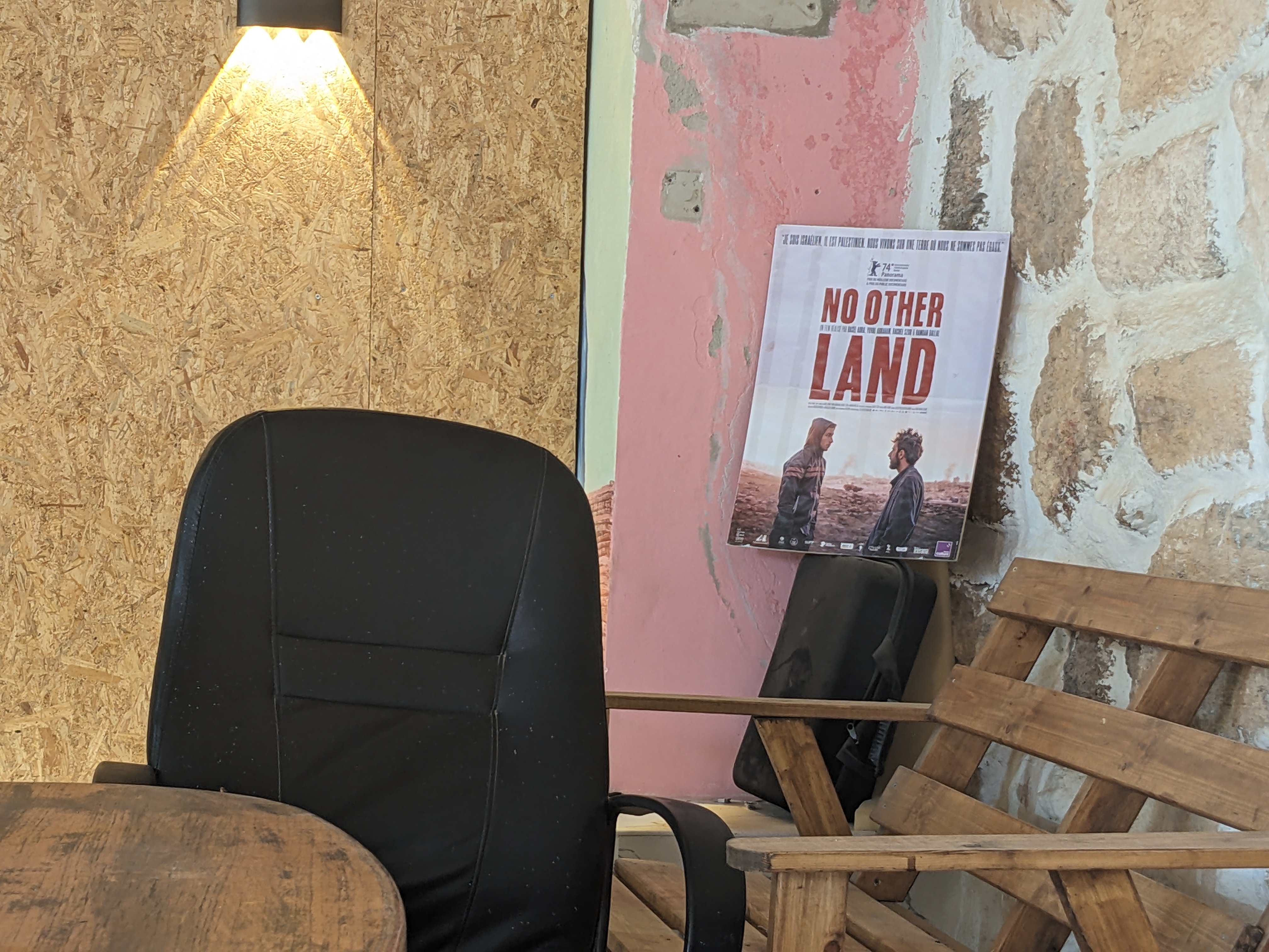 Links: Hebräisches Graffito in Tel Aviv „Ich habe kein anderes Land“, laut Noam schon vor dem 07. Oktober dort zu sehen. Rechts: Filmplakat für „No Other Land“ in einem palästinensischen Dorf bei Umm el Kheir
